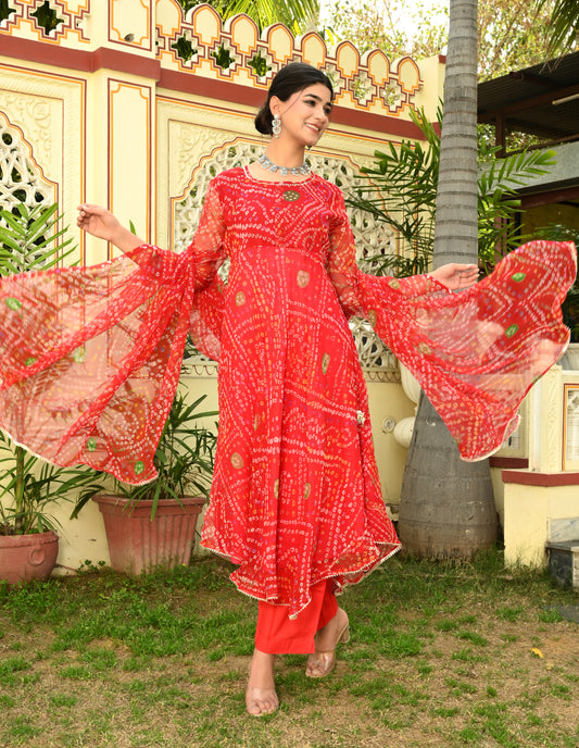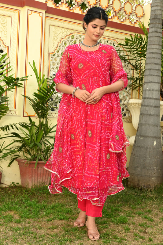 Red Bandhej Georgette Anarkali Suit (Set of 3)