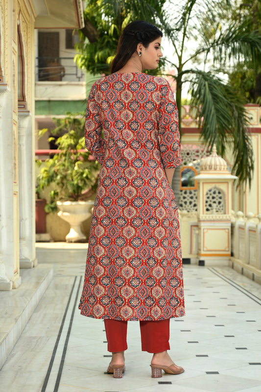 Maroon Ajrakh Printed Cotton Kurta Pants (Set of 2)