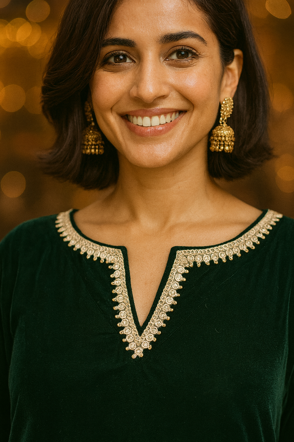 Emerald green velvet co-ord set featuring a delicately embellished neckline, perfect for elegant festive evenings