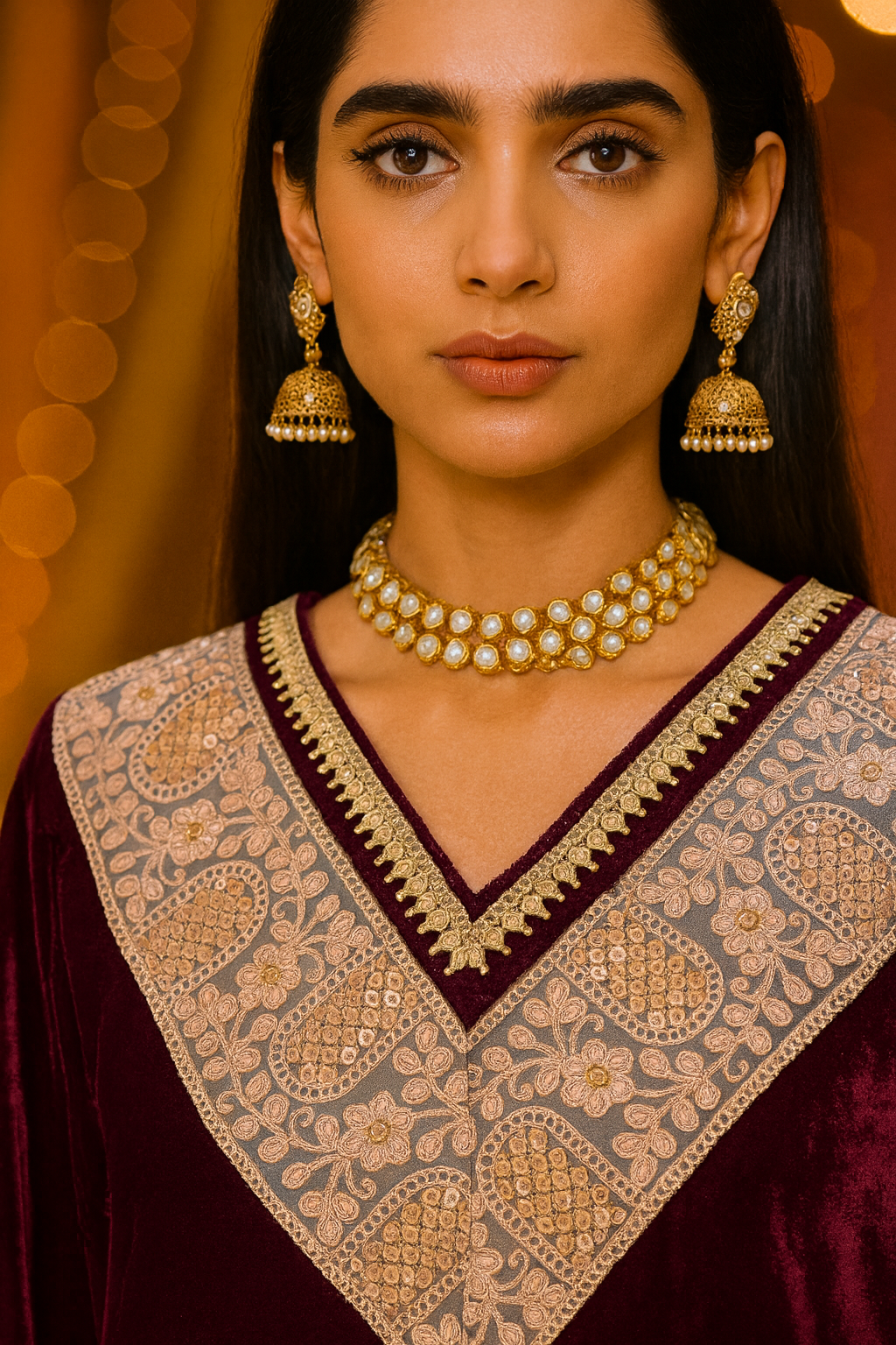 A luxurious maroon velvet co-ord set adorned with intricate gold embroidery for an elegant festive look.